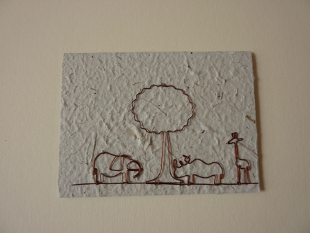 Kaart handgemaakt van restproducten: Waterhyacint, papier, blikmateriaal, kartonverpakkingen en ijzerdraadjes.