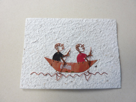 Kaart handgemaakt van restproducten: Waterhyacint, papier, blikmateriaal, kartonverpakkingen en ijzerdraadjes.